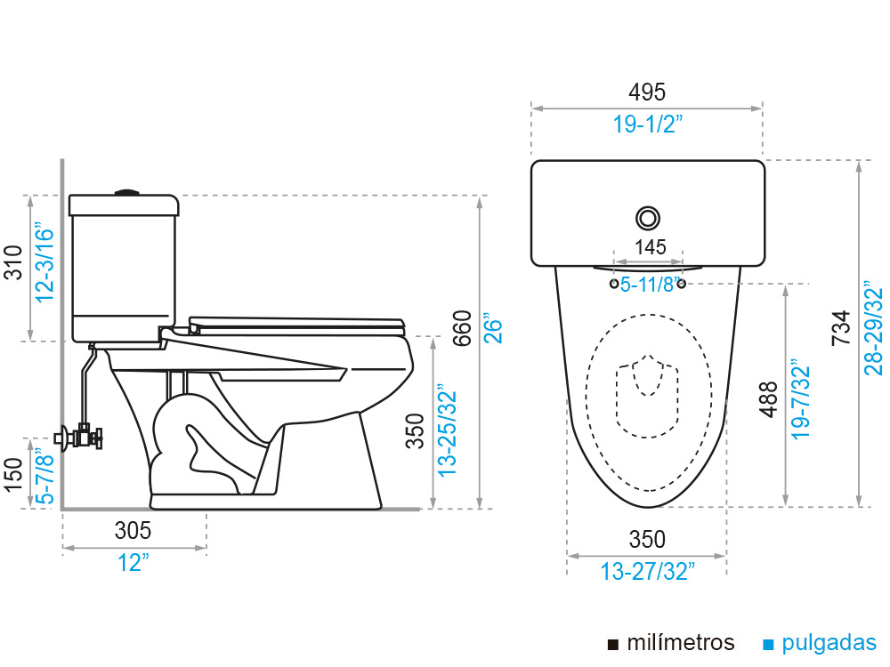Las medidas de los productos de porcelana sanitaria se encuentran en milímetros y pulgadas y pueden variar entre un 3% a 5%. |